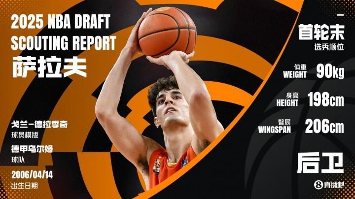 西部联盟高管3号:“这孩子自信爆棚,和勇士的波杰姆斯基一个路数,后者最厉害的就是自带‘老子天下第一’的气场。萨拉夫也这样,持球时根本拦不住。进攻端已经是NBA级别,防守虽会受考验但肯定能适应。他自认为是乔丹附体,可能有点疯,但每次我看他代表以色列或乌尔姆(德国职业联赛球队)打比赛,都敢为他的表现打包票。本届大概有13-15个值得赌的苗子,而他在20多顺位初段被选我会觉得很值。绝对能在某支球队的轮换里站稳脚跟,如果去了一支真正了解他的队伍,首份合同后必拿大合同,夏季联赛会杀疯的。”