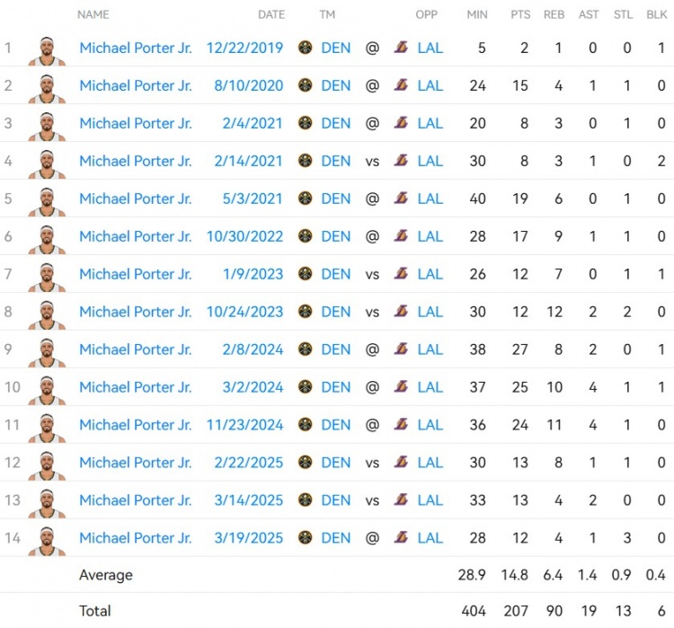 数据统计显示,波特常规赛对阵湖人场均上场28.9分钟,可贡献14.8分6.4篮板和1.4次助攻。